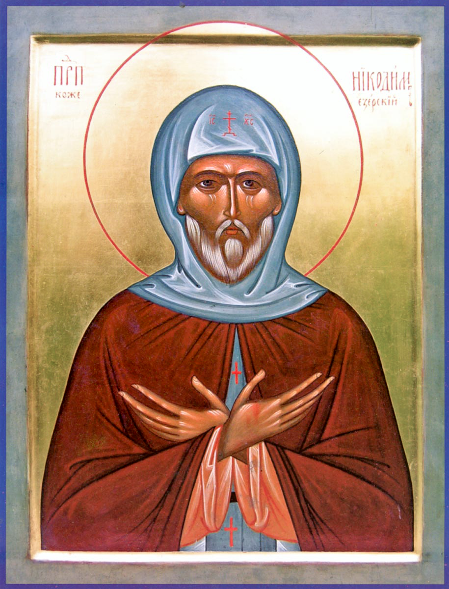 Проповедают подвиги твоя, преподобне Никодиме, вси концы земли, люботрудному житию твоему чудящеся. Воздвиже бо на тя брань лютую враг спасения, прираженьми плоти и уныния тебе искушая; ты же постом и молитвою таковая соодолел еси, благодарственне воспев Богу: Аллилуиа.