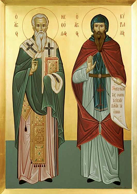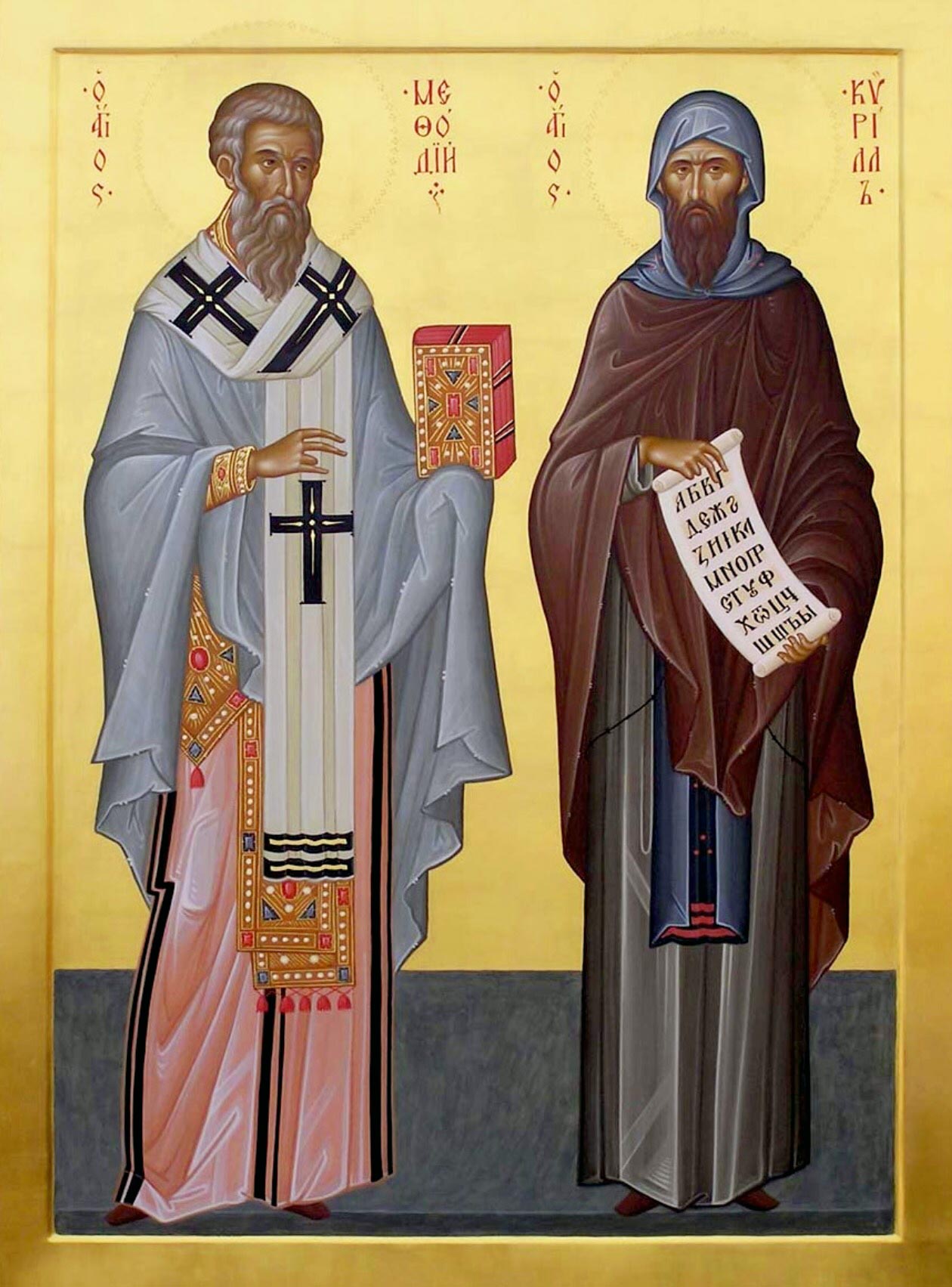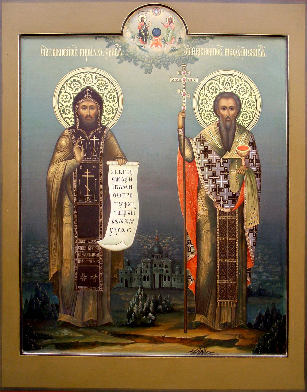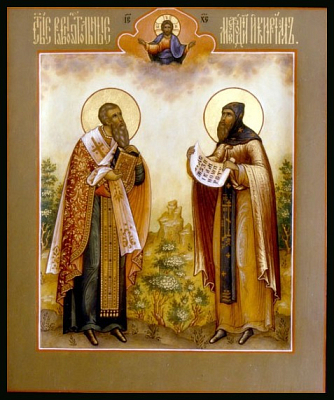 Святые равноапостольные первоучители и просветители славянские, братья Кирилл и Мефодий происходили из знатной и благочестивой семьи, жившей в греческом городе Солуни. Святой Мефодий был старшим из семи братьев, святой Константин (Кирилл – его монашеское имя) – самым младшим. Святой Мефодий был сначала в военном звании и был правителем в одном из подчиненных Византийской империи славянских княжеств, по-видимому, Болгарском, что дало ему возможность научиться славянскому языку. Пробыв там около 10 лет, святой Мефодий принял затем монашество в одном из монастырей на горе Олимп. Святой Константин с малых лет отличался большими способностями и учился вместе с малолетним императором Михаилом у лучших учителей Константинополя, в том числе у Фотия, будущего патриарха Константинопольского. Святой Константин в совершенстве постиг все науки своего времени и многие языки, особенно прилежно изучал он творения святителя Григория Богослова. За свой ум и выдающиеся познания святой Константин получил прозвание Философа (мудрого). По окончании учения святой Константин принял сан иерея и был назначен хранителем патриаршей библиотеки при храме Святой Софии, но вскоре покинул столицу и тайно ушел в монастырь. Разысканный там и возвращенный в Константинополь, он был определен учителем философии в Высшей константинопольской школе. Мудрость и сила веры еще совсем молодого Константина были столь велики, что ему удалось победить в прениях вождя еретиков-иконоборцев Анния. После этой победы Константин был послан императором на диспут для прений о Святой Троице с сарацинами (мусульманами) и также одержал победу. Вернувшись, святой Константин удалился к брату своему святому Мефодию на Олимп, проводя время в непрестанной молитве и чтении творений святых отцов.Вскоре император вызвал обоих святых братьев из монастыря и отправил их к хазарам для евангельской проповеди. На пути они остановились на некоторое время в городе Корсуни, готовясь к проповеди. Там святые братья чудесным образом обрели мощи священномученика Климента, папы Римского (память 25 ноября). Там же в Корсуни святой Константин нашел Евангелие и Псалтирь, написанные "русскими буквами", и человека, говорящего по-русски, и стал учиться у этого человека читать и говорить на его языке. После этого святые братья отправились к хазарам, где одержали победу в прениях с иудеями и мусульманами, проповедуя евангельское учение. На пути домой братья снова посетили Корсунь и, взяв там мощи святого Климента, вернулись в Константинополь. Святой Константин остался в столице, а святой Мефодий получил игуменство в небольшом монастыре Полихрон, недалеко от горы Олимп, где он подвизался прежде.Вскоре пришли к императору послы от моравского князя Ростислава, притесняемого немецкими епископами, с просьбой прислать в Моравию учителей, которые могли бы проповедовать на родном для славян языке. Император призвал святого Константина и сказал ему: "Необходимо тебе идти туда, ибо лучше тебя никто этого не выполнит". Святой Константин с постом и молитвой приступил к новому подвигу. С помощью своего брата святого Мефодия и учеников Горазда, Климента, Саввы, Наума и Ангеляра он составил славянскую азбуку и перевел на славянский язык книги, без которых не могло совершаться Богослужение: Евангелие, Апостол, Пс