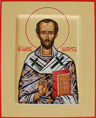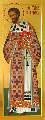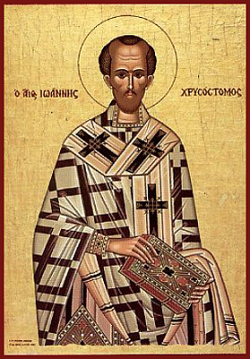 Златозарнаго и златословеснаго, почтим Златоустаго Иоанна, вся позлатившаго златовидными сиянии учения и мир языком просветивша, злата светлейшим и света полнейшим, источающим благодать Божественную.