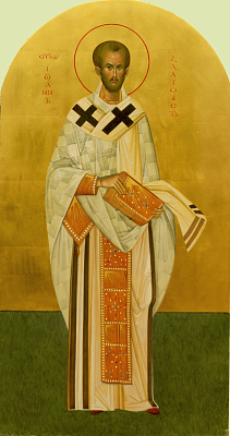 Святитель Иоанн Златоуст, архиепископ Константинопольский, один из трех Вселенских святителей, родился в Антиохии ок. 347 года, в семье военачальника. Его отец, Секунд, умер вскоре после рождения сына. Мать святого Иоанна, Анфуса, оставшись в двадцать лет вдовой, не стала более выходить замуж и отдала все силы воспитанию сына в правилах христианского благочестия. Юноша учился у лучших философов и риторов. Но, пренебрегая суетными знаниями язычников, будущий святитель рано обратился к углубленному изучению Священного Писания и молитвенному созерцанию. Святитель Мелетий, епископ Антиохийский (память 12 февраля), полюбивший Иоанна, как сына, наставил его в вере и в 367 году крестил. Через три года святой Иоанн был поставлен во чтеца. После того, как святитель Мелетий был отправлен в ссылку императором Валентом в 372 году, Иоанн совместно с Феодором (впоследствии – епископом Мопсуетским) учился у опытных наставников подвижнической жизни, пресвитеров Флавиана и Диодора Тарсийского. Особенное влияние на юношу оказал высокообразованный Диодор. Когда скончалась мать Иоанна, он принял иночество, которое называл "истинной философией".
