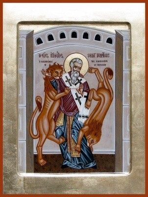 Апостольских нравов подражателю/ и престола их снаследниче,/ архиереев удобрение/ и мучеников славо, богодухновенне,/ на огнь, и меч, и звери дерзнул еси веры ради/ и, слово истины исправляя, до крове пострадал еси,/ священномучениче Игнатие,/ моли Христа Бога// спастися душам нашим.