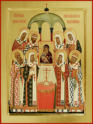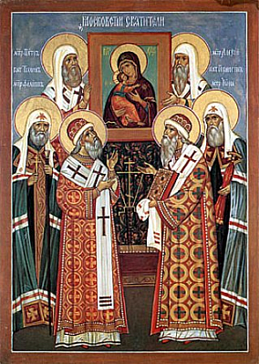 Первопрестольницы Российстии,/ истиннии хранителие апостольских преданий,/ столпи непоколебимии, православия наставницы,/ Петре, Алексие, Ионо, Филиппе и Ермогене,/ Владыку всех молите/ мир вселенней даровати// и душам нашим велию милость.