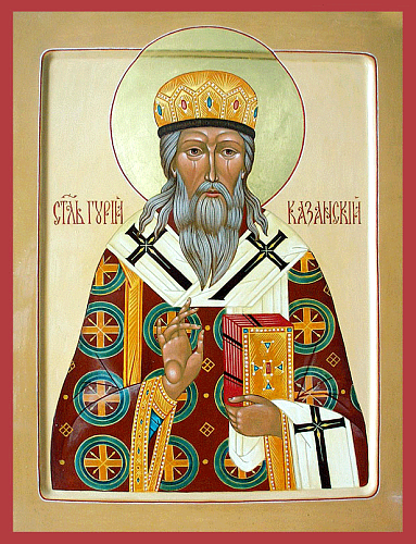 Ангелов Творец и всея твари Содетель предъизбра, освяти и постави тя, святителю, просветителя, учителя и покровителя граду Казани. Нас же научи вопити тебе сице: Радуйся, предопределенный в предвечном совете Божием к просвещению неверных; Радуйся, предочищенный для сего служения сосуде благодати Божия. Радуйся, злато, искушенное в горниле долговременных страданий; Радуйся, с юности миром отверженный и мира отвергийся. Радуйся, в темницу невинно, яко Иосиф, заключенный; Радуйся, в той темнице небесней премудрости научивыйся. Радуйся, в темнице тойже свет, даровавший тебе свободу, узревый; Радуйся, из нея чудным образом изведенный. Радуйся, по получении свободы всего себе Богу поработивый; Радуйся, чистоты и девства хранителю. Радуйся, поста и молитвы ревностный блюстителю; Радуйся, добльственный Христа последователю. Радуйся, Гурие, Казанский и Свияжский чудотворче.