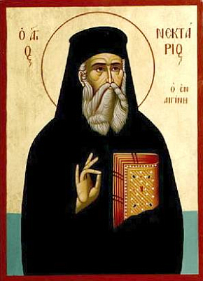 Преподобнически пожив, яко мудрый иерарх,/ прославил еси Господа/ добродетельным житием, Нектарие преподобне./ Темже, Утешителя прославлен силою,/ Божественными мощми твоими,/ демоны отгониши и болящия исцеляеши,/ верою приходящия ти.