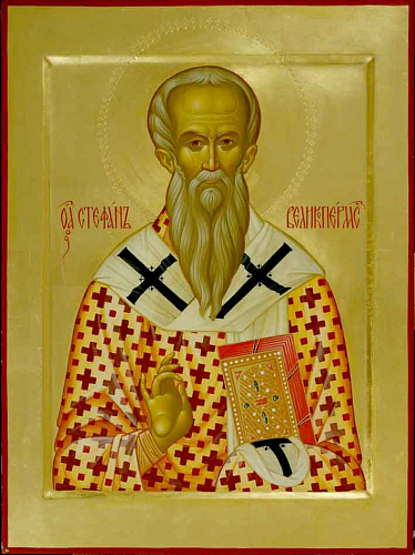 Весь, Стефане пречудне, телом и душею посвятился еси Богу, пребывая в непрестанных трудех Божественнаго богословия и презирая угрожения нечестивых, претящих ти проповедати славу Божию. Сего ради вопием ти: Радуйся, земный Ангеле; Радуйся, небесный человече. Радуйся, вития непобедимый; Радуйся, воине Христов неустрашимый. Радуйся, христианскаго благочестия истинный ревнителю; Радуйся, врагов Церкве Христовы обличителю. Радуйся, нечестивых витий посрамителю; Радуйся, столпе, от нощи неведения к Солнцу Правды приводяй. Радуйся, уста божественная, миру спасение возвещающая; Радуйся, гласе небесныя истины, буих умудряяй. Радуйся, неверных светом Евангелия Христова просветивый; Радуйся, подобно теплоте солнечней, оляденевшая сердца их согреявый и тем плод мног Церкви Божией принесый. Радуйся, Стефане, великий чудотворче.