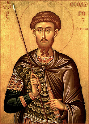 Святой мученик Феодор Тирон был воином в городе Аласии Понтийской области (северо-восточная область Малой Азии, тянувшаяся вдоль берега Понта Эвксинского, т. е. Черного моря), под начальством некоего Вринка. Его принуждали принести жертву идолам. Святой Феодор твердо во всеуслышание исповедал свою веру во Христа Спасителя. Начальник дал ему несколько дней на размышление, во время которых святой Феодор усиленно молился. Его обвинили в поджоге языческого храма и бросили в темницу на голодную смерть. Там ему явился Господь Иисус Христос, утешил и подкрепил его. Приведенный вновь к правителю, святой Феодор еще раз смело и безбоязненно исповедал свою веру, за что был предан новым истязаниям и осужден на сожжение. Мученик Феодор без трепета взошел на костер и с молитвой и славословием предал свою святую душу Богу.